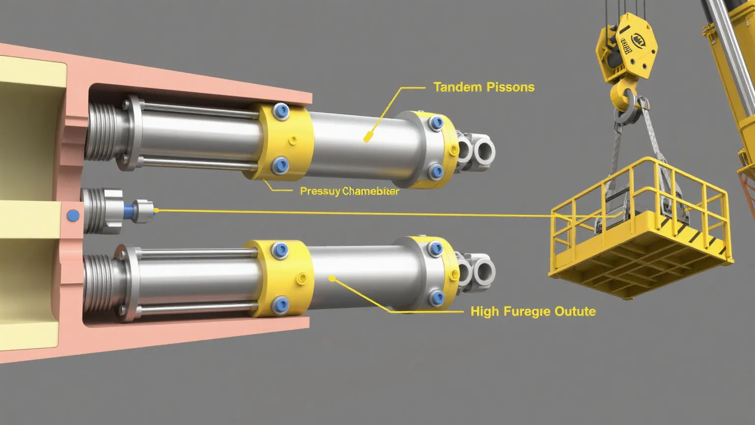 Tandem hydraulici cylindri tollunt omnia circa vim violentam. Pistores duo vel plures in ordine intus cylindri iaciuntur, quo magis elevandi vim sine cylindro latiorem faciunt. Bonum ad gravia machinarum suggestarum quae opus sunt ut re vera magna onera lente erigant-cogitare sublevationes industriales radios ferri vel magni ponderis verticalis spartorum movere quae vires in skimdere non possunt.