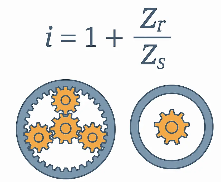 Formula calculandi tradendi rationem reducendi planetarii actu non implicata est. Frequentissima structura est quod calces solis est activus, anulus interior figitur, et planeta ferebat output. Sub hac structura, formula ratio tradendi computandi est: